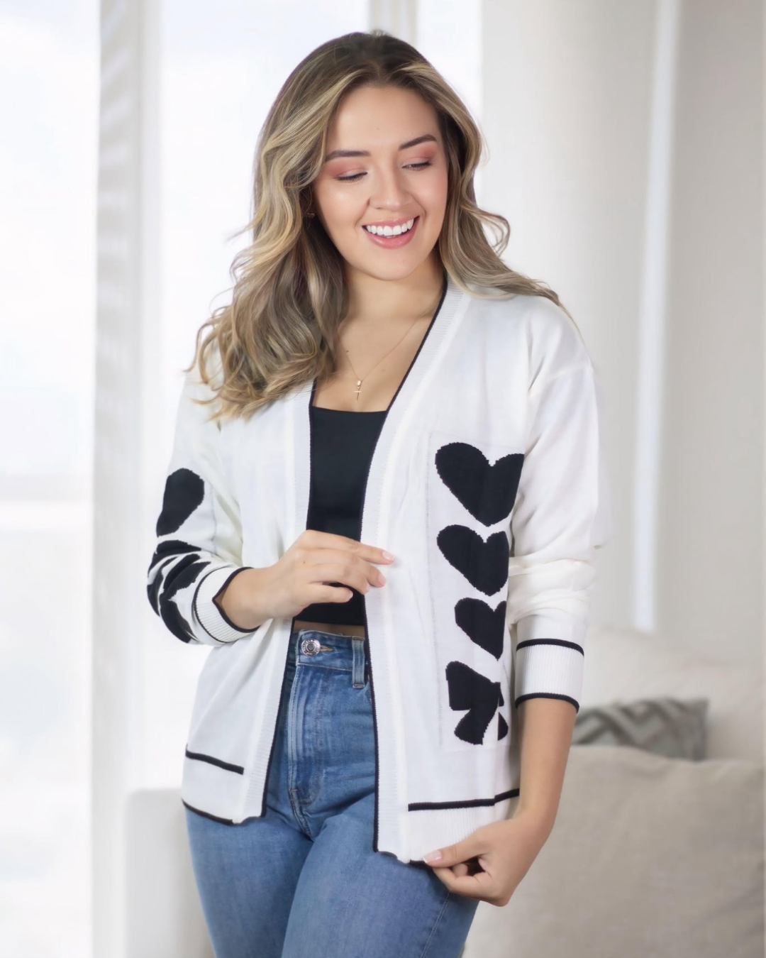 Dale un toque femenino y encantador a tu look con este saco tejido en hilo suave, inspirado en el delicado estilo coquette. Su diseño con corazones y moño aporta un detalle romántico y moderno que eleva cualquier outfit. Perfecto para combinar con jeans, vestidos o básicos, creando looks casuales pero con mucha personalidad. Es una prenda versátil, ligera y cómoda, ideal para usar en cualquier momento del día.Tejido en hilo suave Diseño de corazones estilo coquetteTalla única Disponible en varios colores: Fucsia, Beige, Verde, Vinotinto y blanco